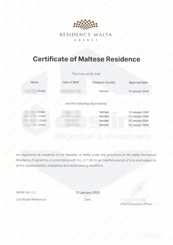 | Kết quả | Giấy chứng nhận cư trú (Certificate of Maltese Residence) | Thư chấp thuận chính thức (Letter of Final Approval) |