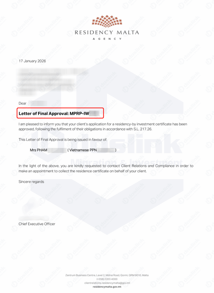Doslink chúc mừng khách hàng T. Phạm và gia đình đã nhận được Thư chấp thuận chính thức (Letter of Final Approval) cho hồ sơ đầu tư định cư Malta. Kết quả này là minh chứng cho sự quyết đoán và thay đổi chiến lược đúng đắn, mở ra một tương lai đầy hứa hẹn tại châu Âu.