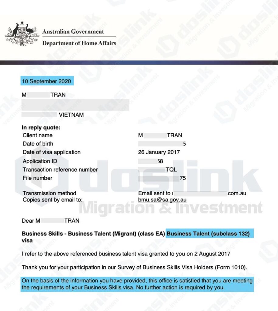 Đúng sau hai năm kinh doanh tại Nam Úc, Tư Vấn Di Trú của Doslink đã nộp hồ sơ hậu kiểm visa 132A của anh M… vào tháng 03/2020, và kết quả hậu kiểm được Bộ Di Trú Úc chấp thuận chỉ trong vòng 06 tháng (so với trung bình từ 12-18 tháng), một thời gian xét duyệt kỉ lục đặc biệt trong thời điểm đại dịch Covid-19 này.