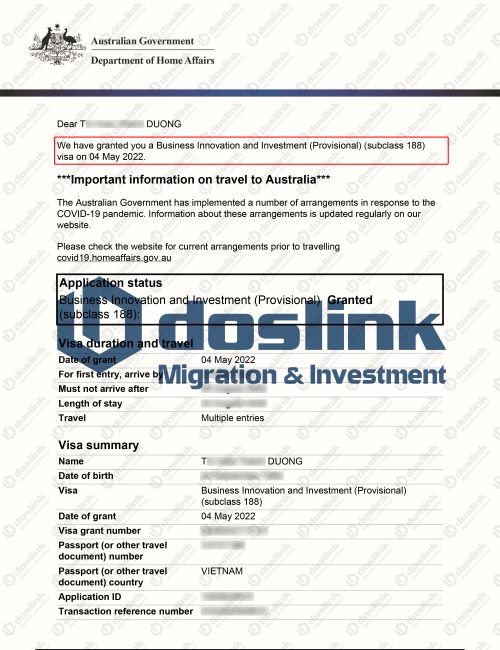 Doslink xin chúc mừng gia đình khách hàng T. Dương đã thành công nhận được visa 888A – visa thường trú nối tiếp visa 188A.