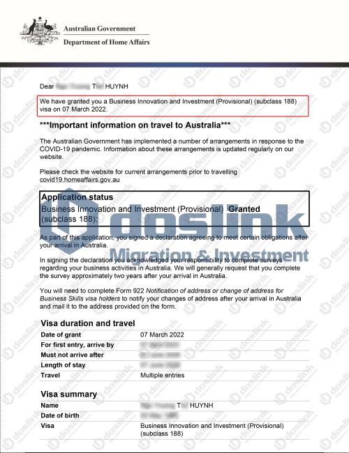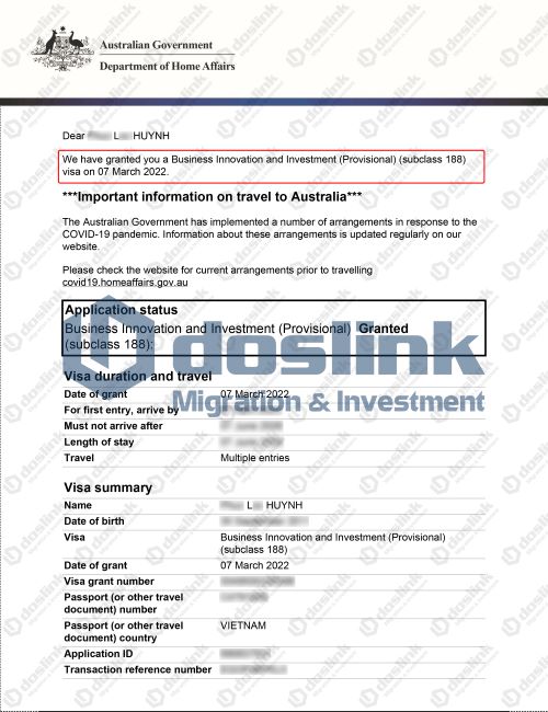 Chúc mừng gia đình KH T... Huỳnh đã được cấp Visa 188B - Đầu Tư Trái Phiếu Úc vào ngày 07/03/2022 theo điều kiện bảo lãnh bang Queensland.