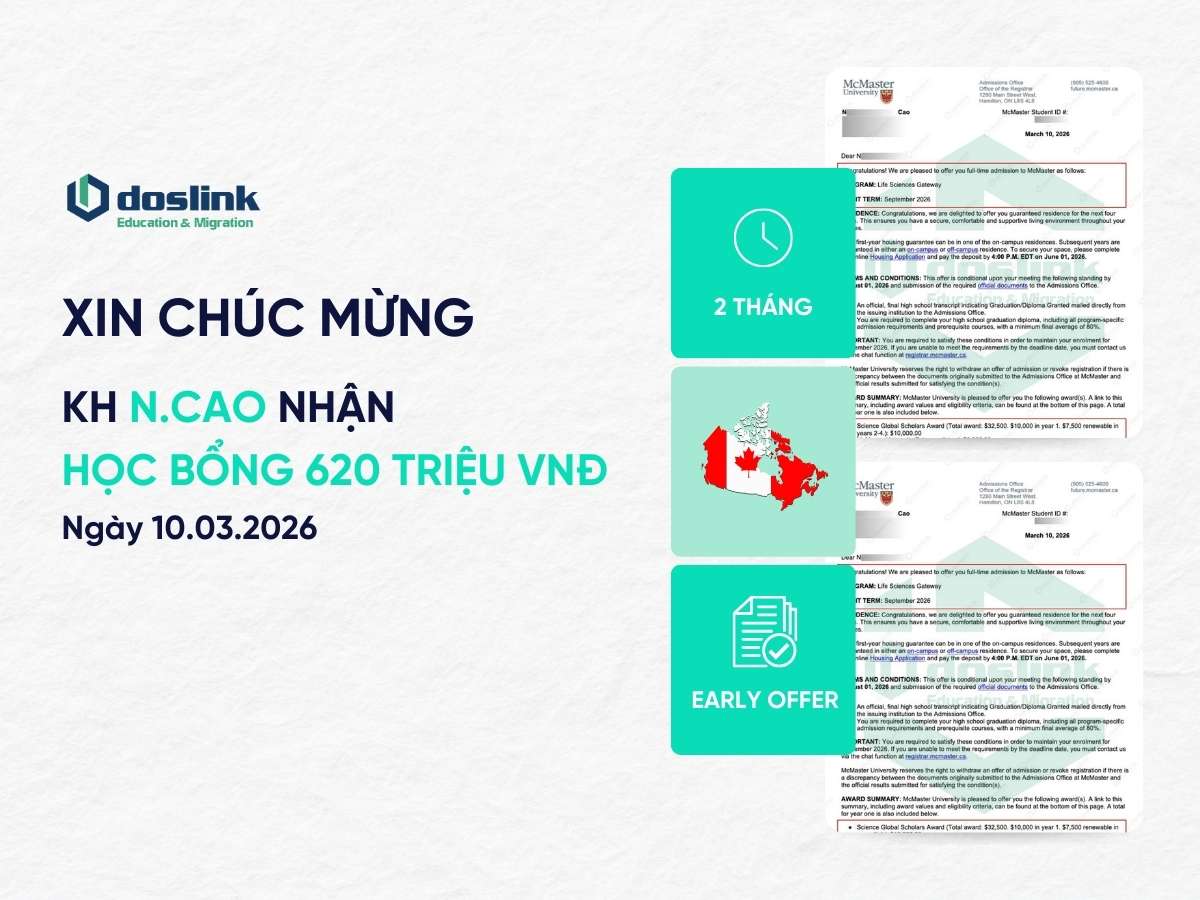 Sau đó vì dịch COVID mà bạn phải tạm quay về Việt Nam để gia đình yên tâm. Đến cuối năm 2023, tức 3 năm sau đó, bạn tiếp tục liên hệ Doslink để làm hồ sơ visa du học bậc Đại học.