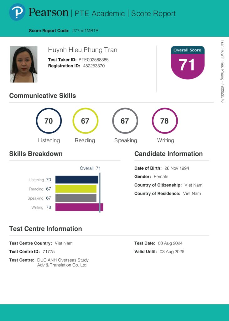 | 1 | Trần Huỳnh Hiếu Phụng | 1994 | Phó giám đốc kiêm Tư vấn du học | Cử nhân Kinh tế | Kinh tế | PTE 71 | Có |