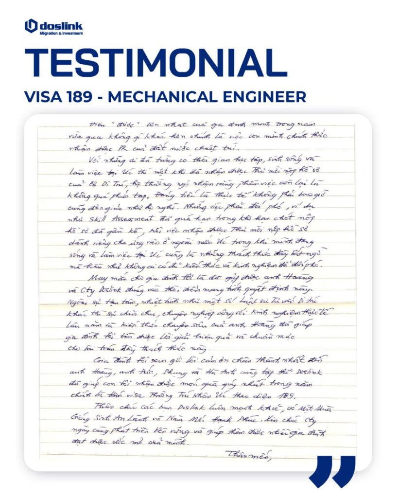 Doslink chúc mừng khách hàng K. Vũ đã thành công nhận được visa 189 - visa thường trú Úc diện tay nghề độc lập. Đây là dòng visa danh giá của Úc, có mức độ cạnh tranh rất cao đến từ tất cả các ứng viên tay nghề trên toàn thế giới.